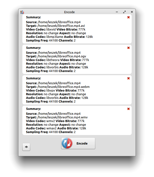 Encode bietet clevere Funktionen die das Konvertieren von einer Datei, mittels Warteschlange, nicht nur in ein anderes sondern mehrere andere Formate unterstützt. Gibt man beispielsweise einen Podcast heraus und benötigt von einer Datei unterschiedliche Kopien in unterschiedlichen Formaten ist das das ideale Tool um dies zu realisieren.