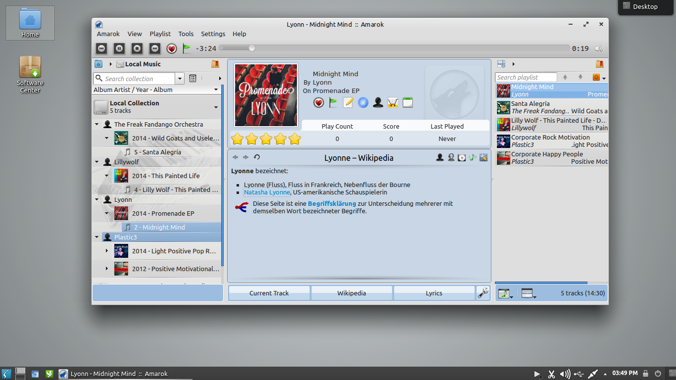 Wer gerne zu seinem Lieblingssong mitsingen möchte dem bietet Amarok auch passend direkt den Liedtext zum aktuell abgespielten Song an. Möchte man darüber hinaus evtl. etwas mehr zum Interpreten erfahren, oder einfach mal schauen was gibt es noch für Alben oder Songs des Interpreten hilft die eingebaute Wikipedia Info Seite, die einem meist eine Biographie sowie Discographie zum Interpreten liefert.