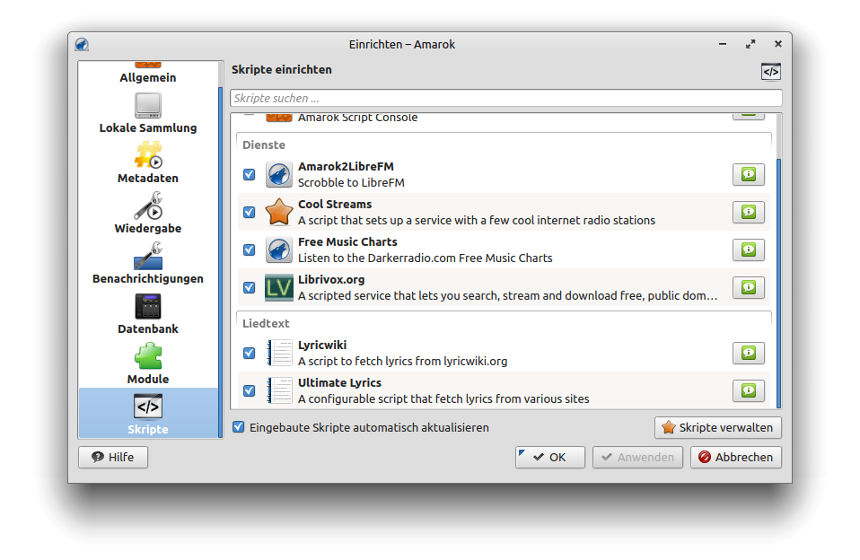 Wer darüber hinaus Amarok erweitern will, dem stehen zahlreiche Skripte zur Verfügung.